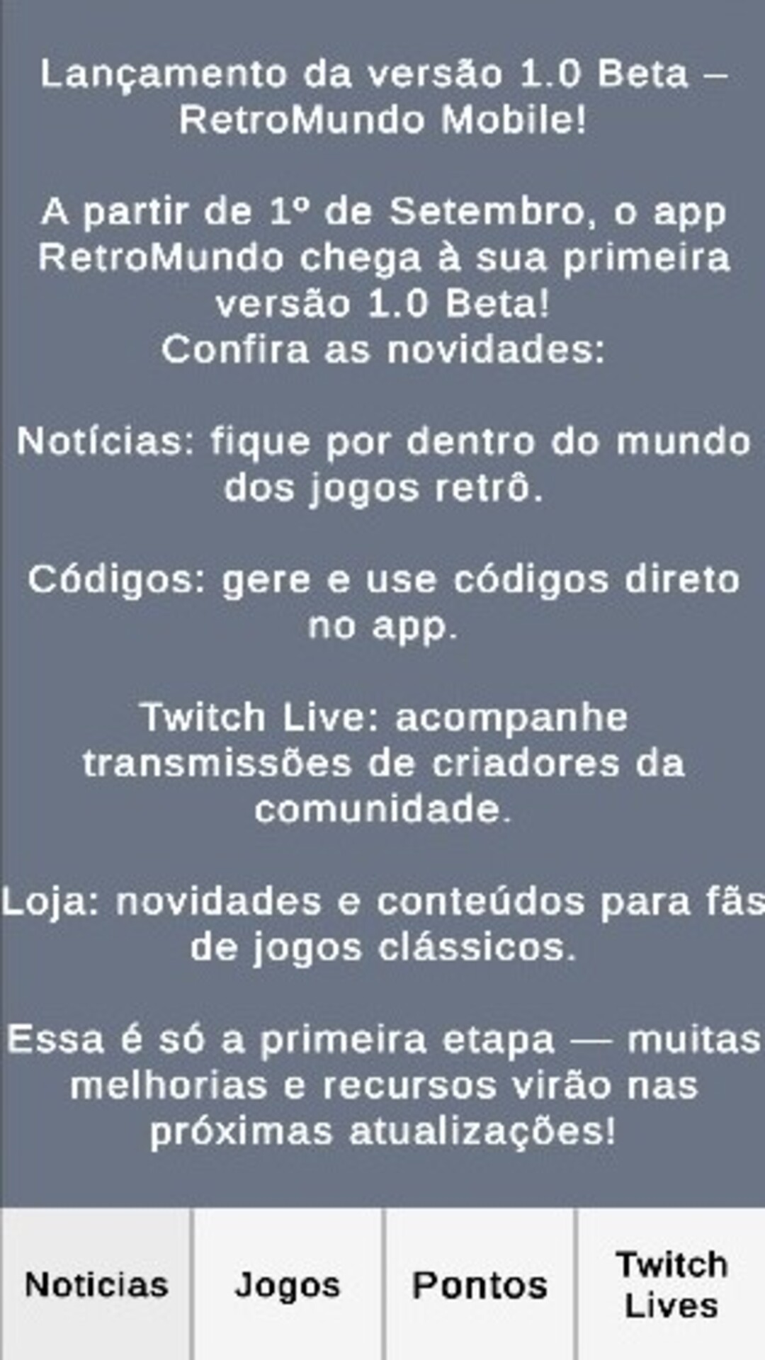 Novo app Retro Comunidade Jogos! Junte-se à nossa comunidade, partilhe os seus jogos favoritos e desfrute de uma experiência retro única. Corrigimos problemas que causavam conflitos com o sistema do Google para garantir um funcionamento mais estável