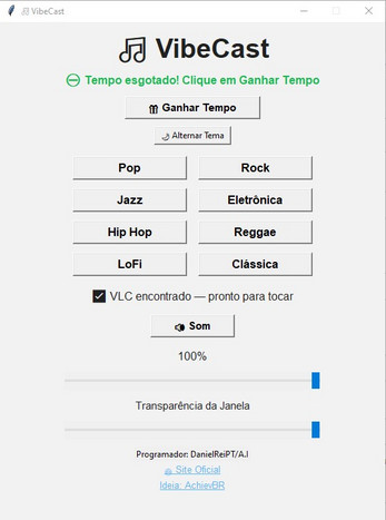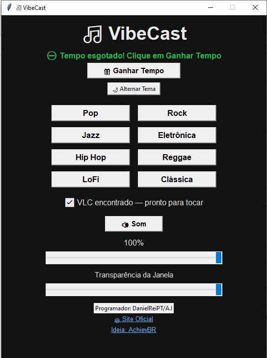VibeCast is a modern app for listening to online radio stations across a variety of genres—Pop, Rock, Lo-Fi, Jazz, Electronic, Hip Hop, Reggae, and Classical—all in a simple, fluid interface. - 💡 Perfect for those who want to listen to background music while working, gaming, or streaming! - ⚙️ System Requirements System: Windows 7, 8, 8.1, 10, 11 (32-bit) RAM: 1 GB minimum, 2 GB recommended CPU: 1 GHz single-core minimum, dual-core recommended VLC: 32-bit installed in the default path Python: 32-bit, version ≥ 3.7 Disk Space: 50–100 MB Internet: Required to play online radio - System: Windows 7, 8, 8.1, 10, 11 (64-bit) RAM: 2 GB minimum, 4 GB recommended CPU: Dual-core minimum VLC: 64-bit installed in the default path Python: 64-bit, version ≥ 3.7 Disk Space: 50–100 MB Internet: Required to play online radio - 🧠 Credits 👨💻 Developer: DanielReiPT / A.I 🌐 Official website: https://danielreipt.wixsite.com/reino/software 📺 Twitch: https://www.twitch.tv/achievbr - ⚠️ License and Use May be freely distributed (commercial and personal use). Modification of the source code is not permitted without the author's permission. Original credits must be maintained.