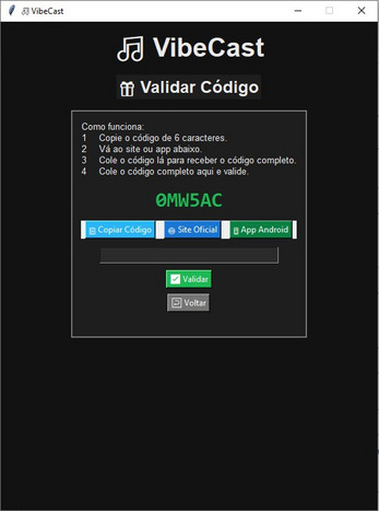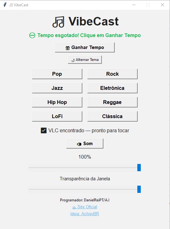 O VibeCast é um aplicativo moderno para ouvir rádios online de diversas categorias — Pop, Rock, Lo-Fi, Jazz, Eletrônica, Hip Hop, Reggae e Clássica — tudo em uma interface simples e fluida. - 💡 Perfeito para quem quer ouvir música de fundo enquanto trabalha, joga ou faz stream! - ⚙️ Requisitos do Sistema Sistema: Windows 7, 8, 8.1, 10, 11 (32-bit) RAM: mínimo 1 GB, recomendado 2 GB CPU: 1 GHz single-core mínimo, dual-core recomendado VLC: 32-bit instalado no caminho padrão Python: 32-bit, versão ≥ 3.7 Espaço em disco: 50–100 MB Internet: necessária para tocar rádios online - Sistema: Windows 7, 8, 8.1, 10, 11 (64-bit) RAM: mínimo 2 GB, recomendado 4 GB CPU: dual-core mínimo VLC: 64-bit instalado no caminho padrão Python: 64-bit, versão ≥ 3.7 Espaço em disco: 50–100 MB Internet: necessária para tocar rádios online - 🧠 Créditos 👨💻 Programador: DanielReiPT / A.I 🌐 Site oficial: https://danielreipt.wixsite.com/reino/software 📺 Twitch: https://www.twitch.tv/achievbr - ⚠️ Licença e Uso Pode ser distribuído livremente (uso comercial e pessoal) Não é permitido modificar o código-fonte sem permissão do autor Créditos originais devem ser mantidos